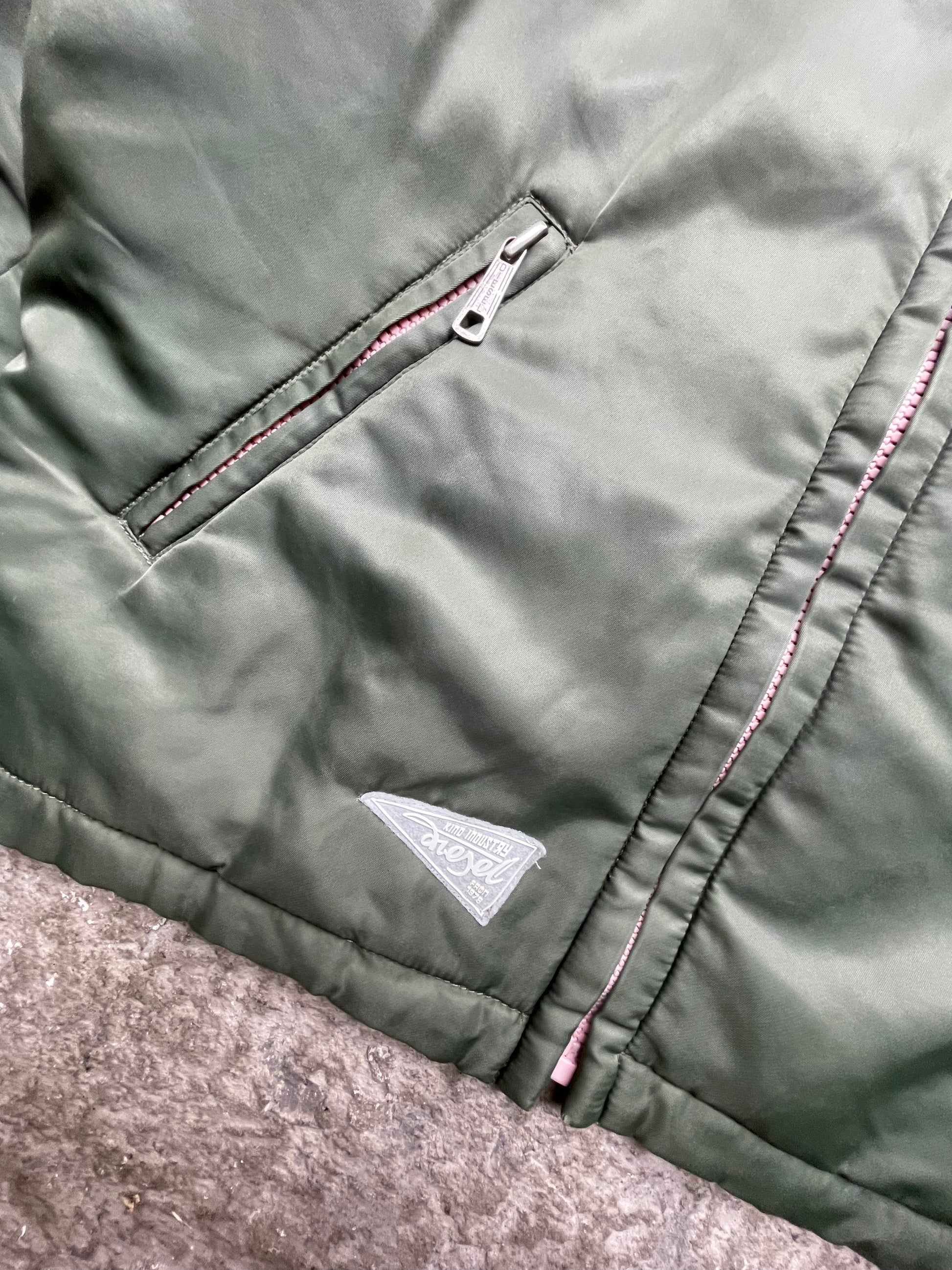 Reflective logo patch, silver zippers with pink details, and a high stand collar.